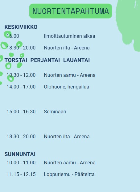 Ohjelmassa on mm. opetuksia, seminaareja ja ylistystä.